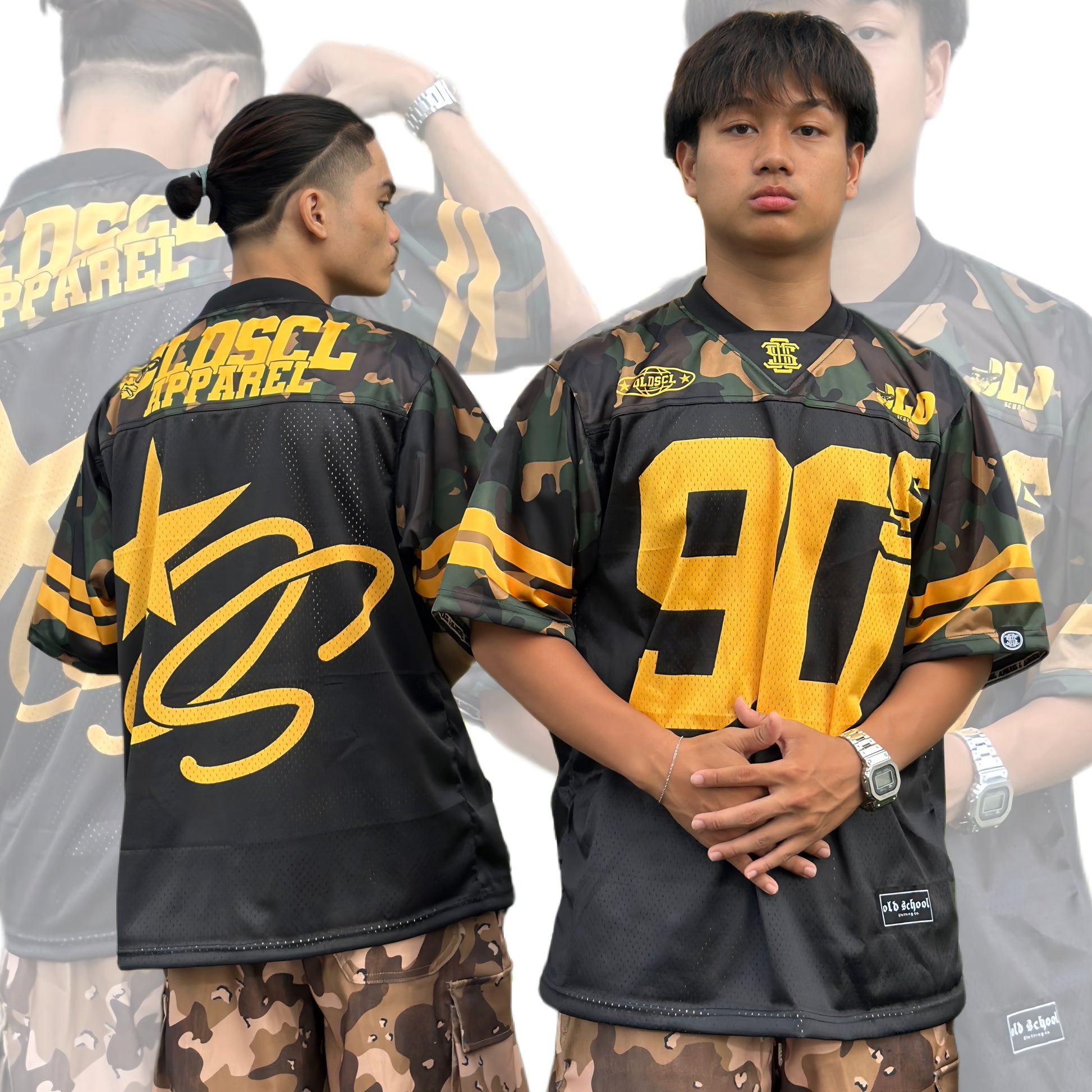 The Camo 90s Hybrid Football Jersey brings back the golden era of 90s sports with a bold modern twist. Featuring striking yellow “90S” text on the front and “DSCL APPAREL” across the back, this piece blends athletic energy with classic Old School confidence.